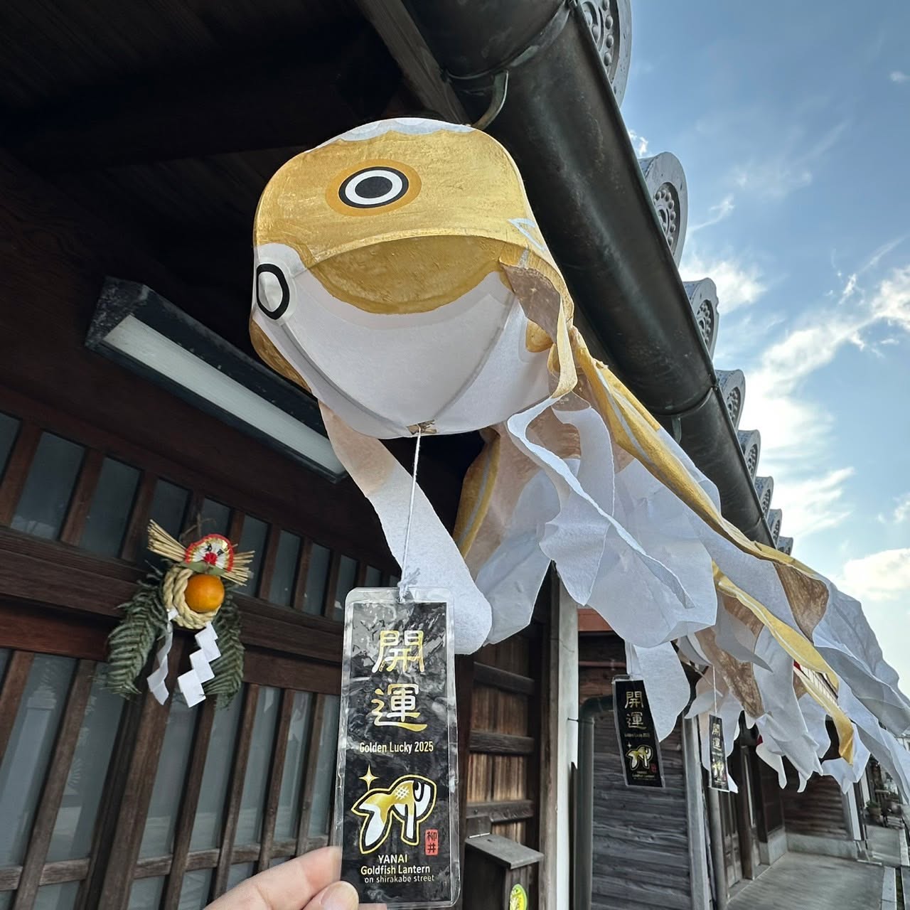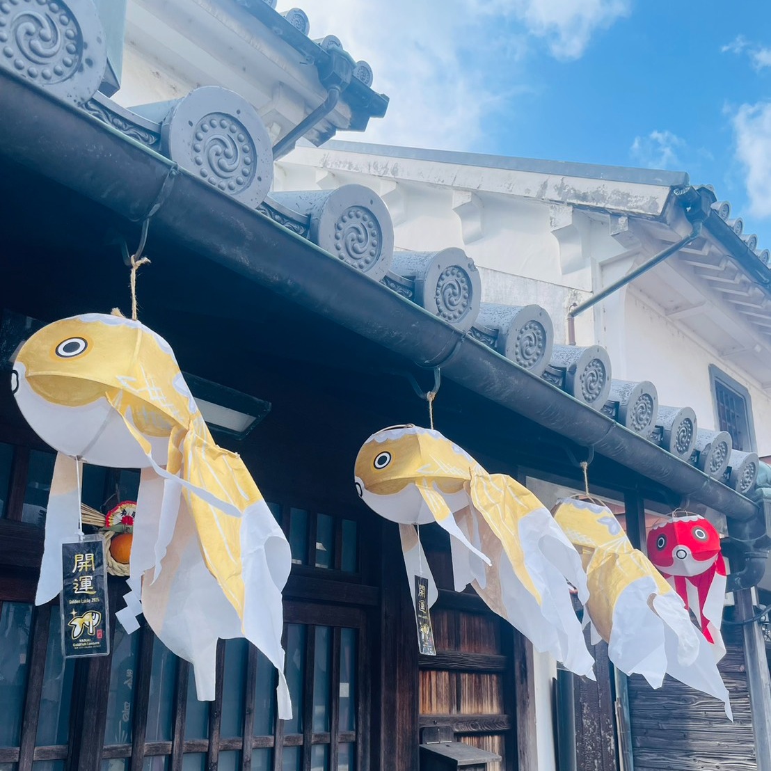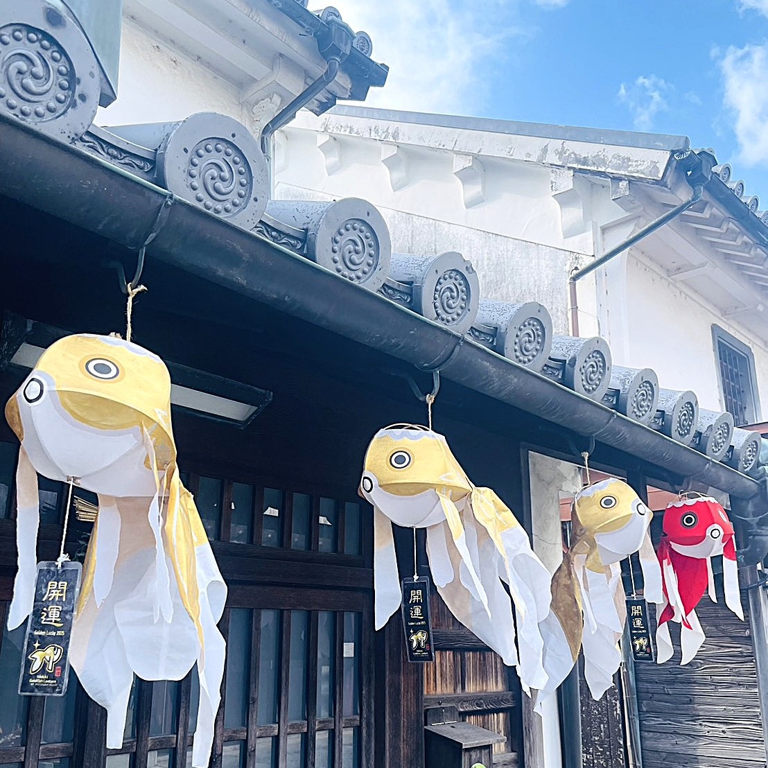 白壁の町並みには期間限定で開運ゴールドの金魚ちょうちんが登場しております。